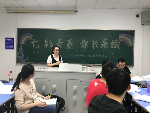 2017年5月16日下午两点半,2014级环工一班以"我的中国梦,奋斗的青春最美丽"为主题在水利馆B202举行了"七彩青春,你我来绘"手绘T恤主题团日活动。杏色 党委副书记曹松祥老师,环境院2014级辅导员曾莉老师也来到了活动现场与同学们进行交流。