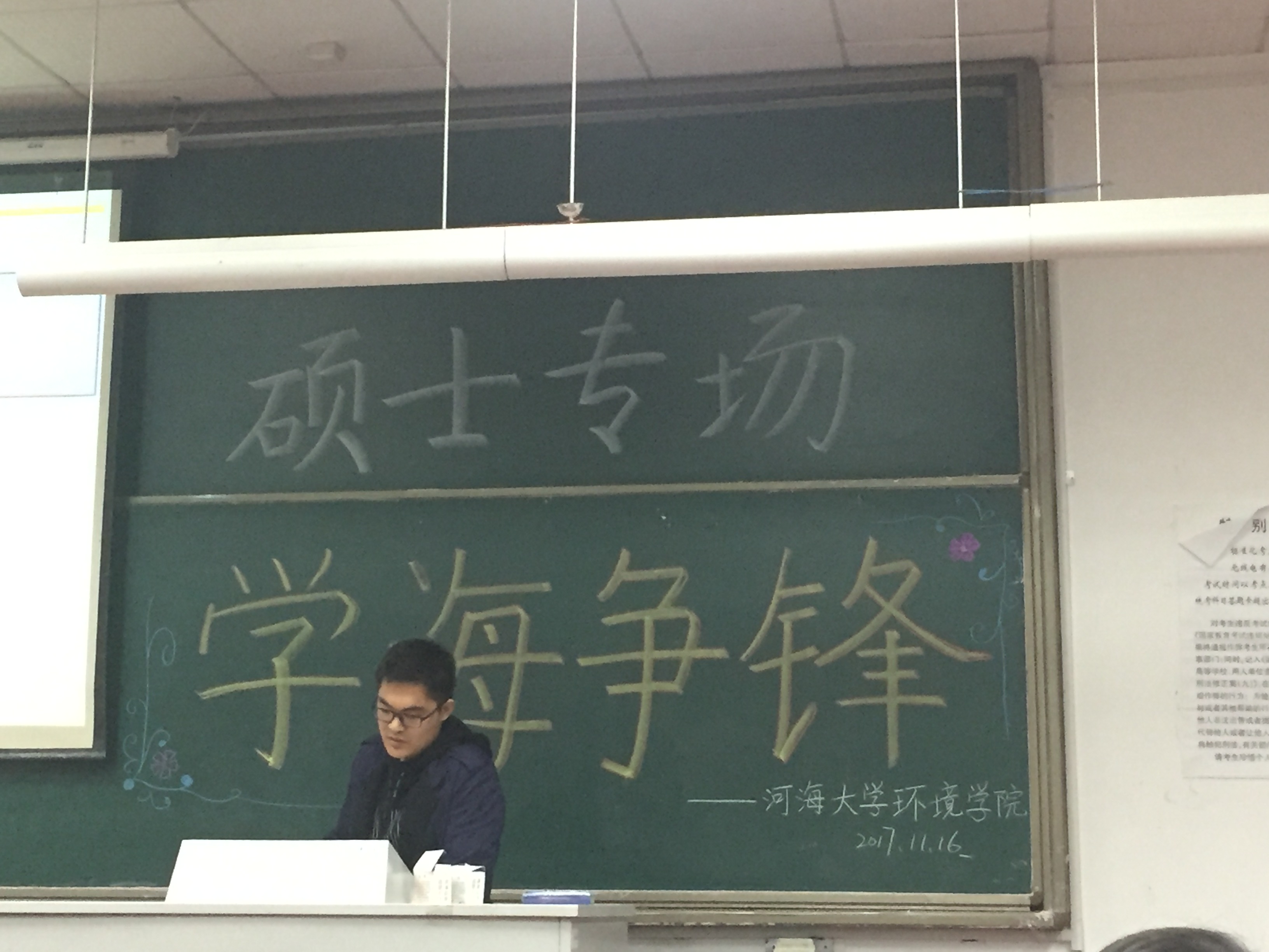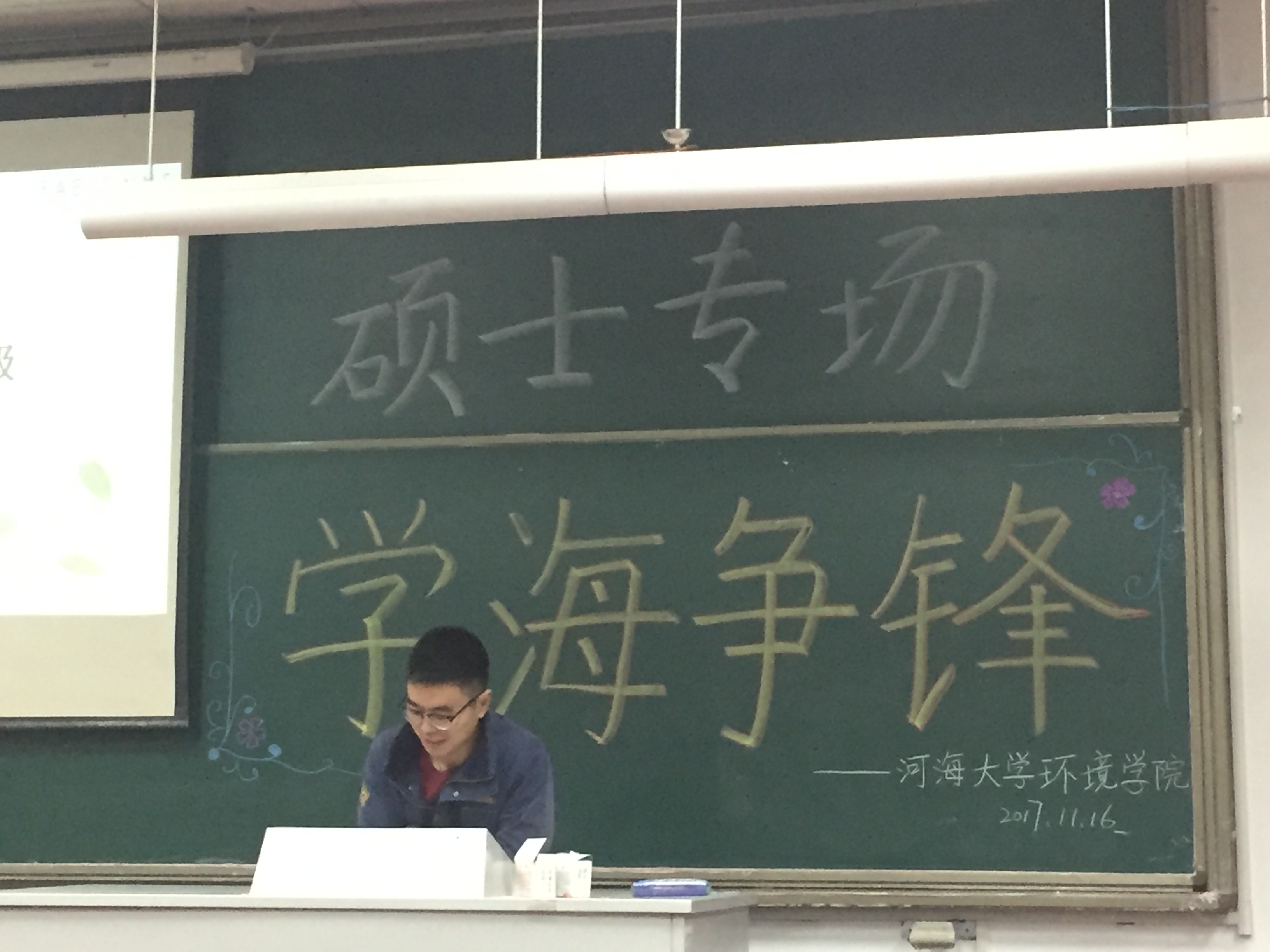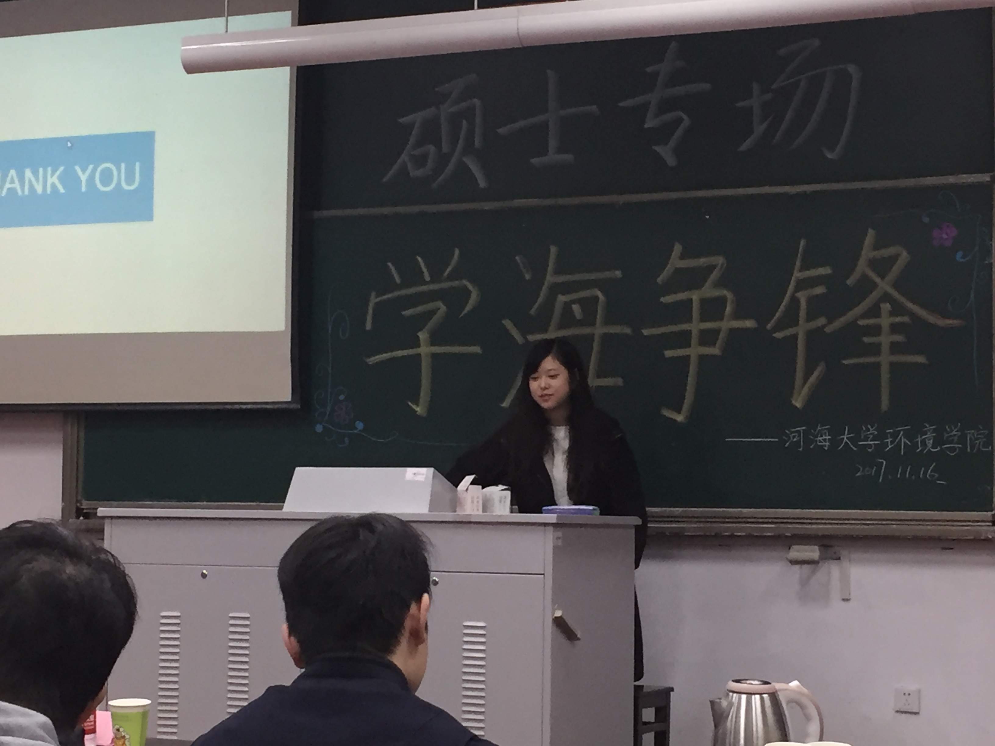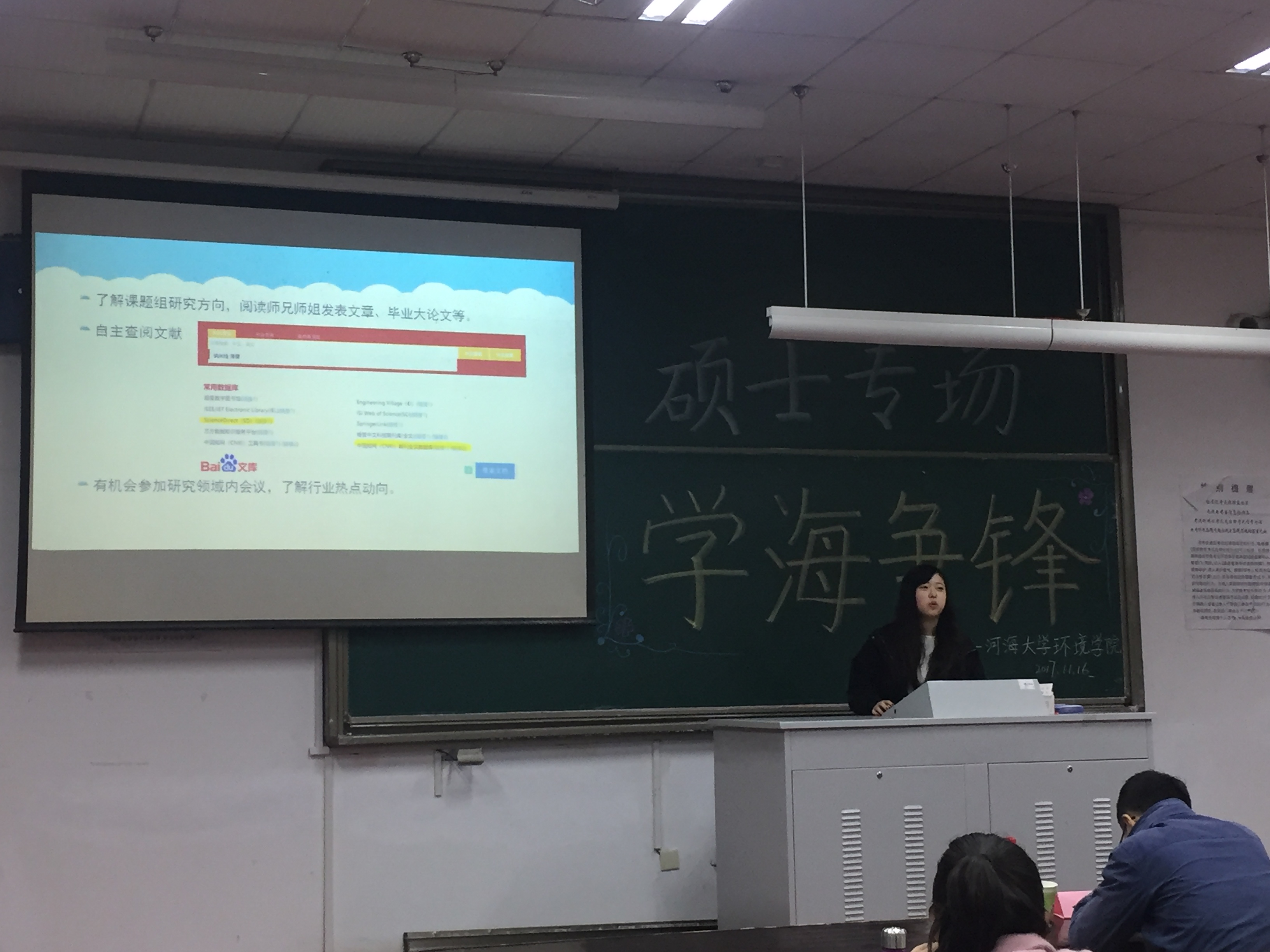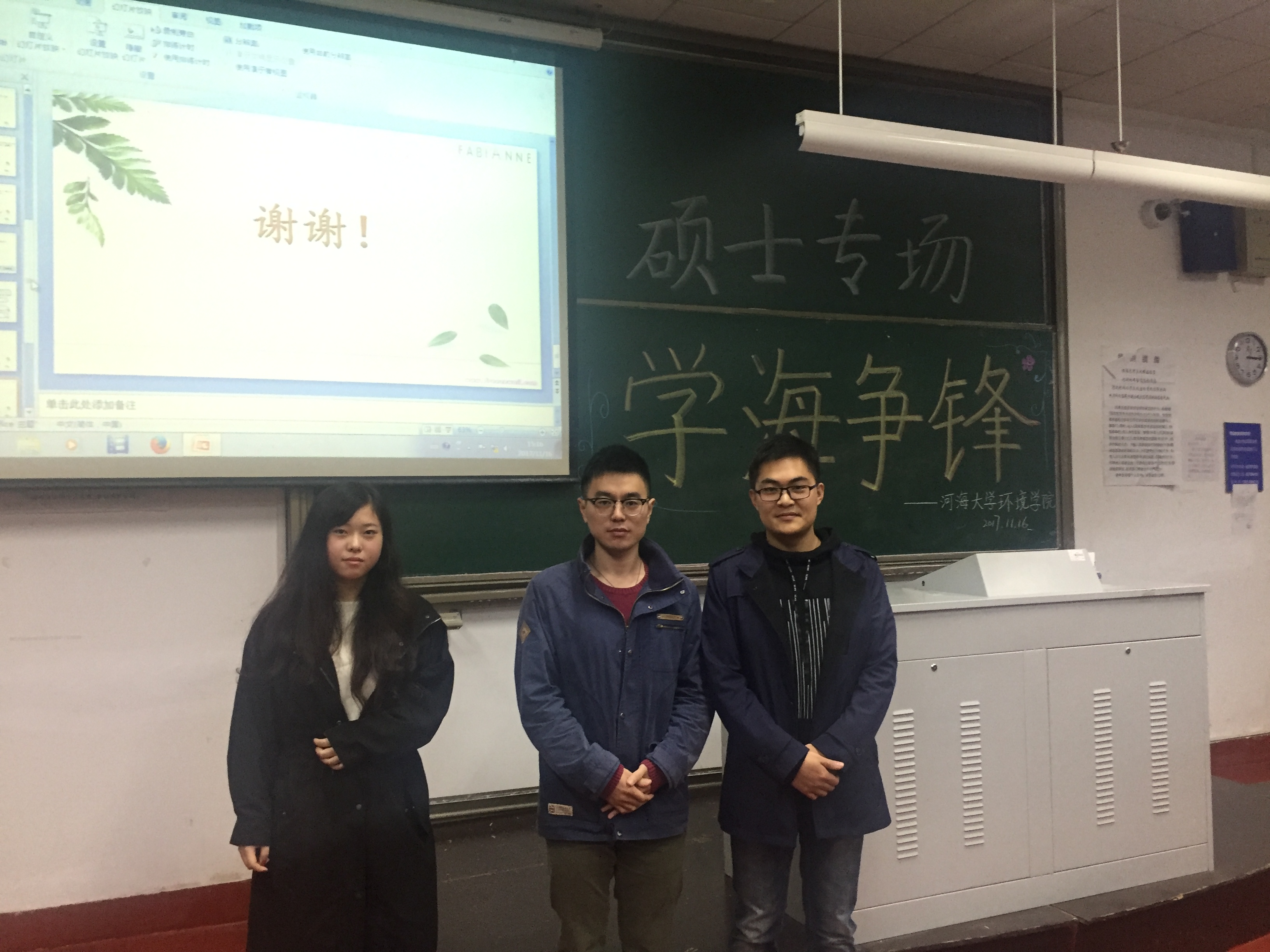 2017年11月16日下午,由杏色 研会研科协策划并举办的“学海争锋——硕士专场”学术讲座于水利馆B101教室举行。本次讲座的三位主讲均是杏色 优秀的研究生,都是今年国家奖学金的获得者,分别是16级市政工程专业的曹臻、15级市政工程的张佳男、15级环境科学与工程的沙海涛。