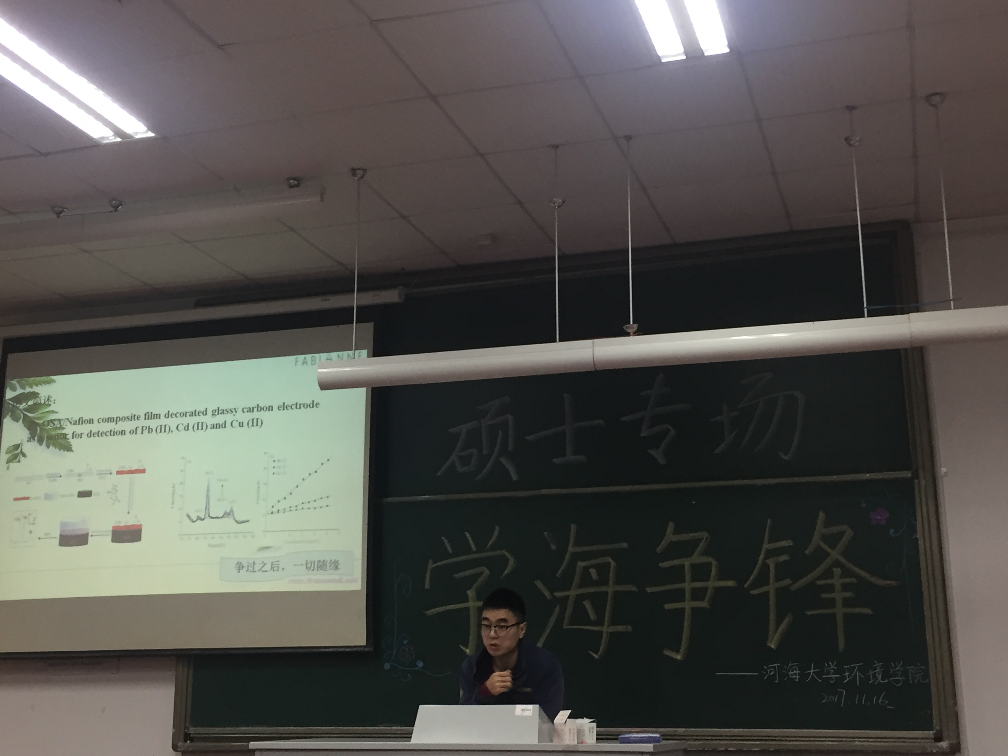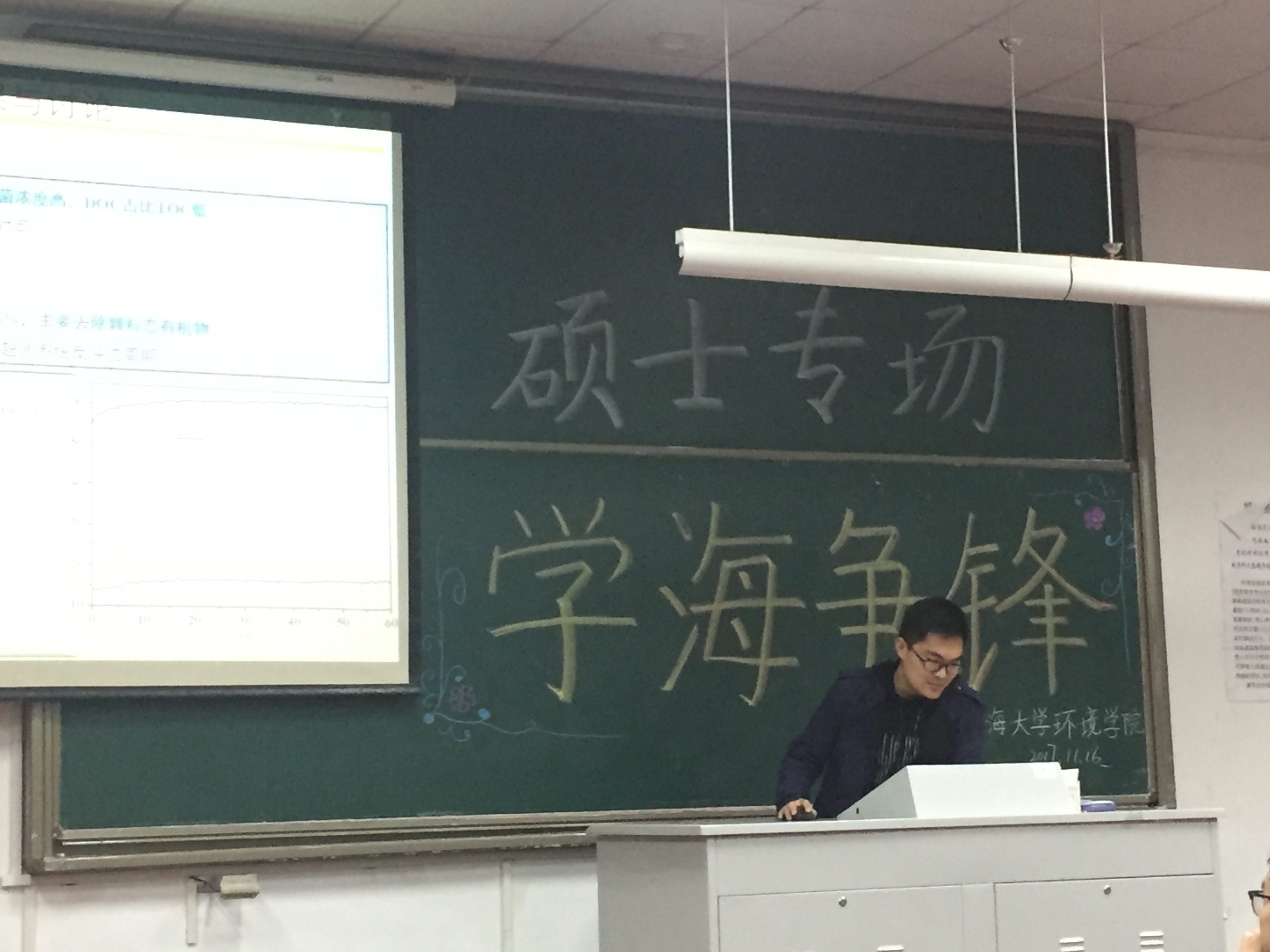 张佳男师兄主要按照学术报告的形式给我们介绍了他自身参与的一个学术课题。报告的题目是:微絮凝/沉淀+预臭氧在超滤回收活性炭池反冲洗水中的应用。师兄详细的从课题的研究背景,到课题的实验实施方案,以及最终实验成果的分析和讨论,给我们进行了一次非常精彩的学术报告。