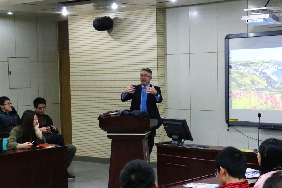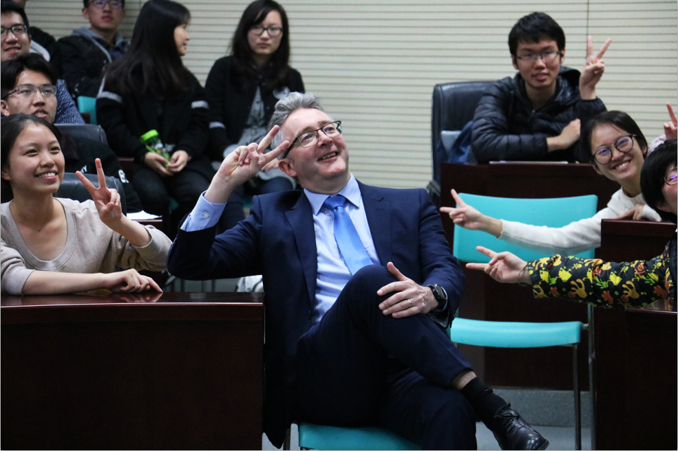 John Grattan教授首先向同学们介绍了亚伯大学的悠久历史、优越的地理位置和优美的环境。在亚伯大学有和在国内截然不同的教学方式,课程相比国内更轻松,但有更多的问题需要学生主动地自行寻找资料和答案。John Grattan教授还热情地与同学们合照。