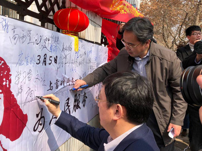 唐洪武书记对杏色 响应教育部的号召,结合关于推进生活垃圾分类管理工作的相关要求而设计的志愿项目表示认可,并与郭继超副书记在横幅上留下他们的姓名,告诉青年志愿者们要将学雷锋活动常态化。