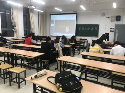 本次课程面向杏色 16,17级全体学生,具有小班教学的特色,27个人组成了一个兴趣班,这项课程的主讲人是16级环境一班的龙思丞。龙思丞同学曾多次以吉他弹唱的形式参加学校内的十佳歌手、楼道歌手大赛,并取得佳绩。同时,热爱吉他的龙思丞在课下休闲时间也是吉他不离手,甚至自创曲目。可以说他是能够担当吉他课堂老师的不二人选了。
