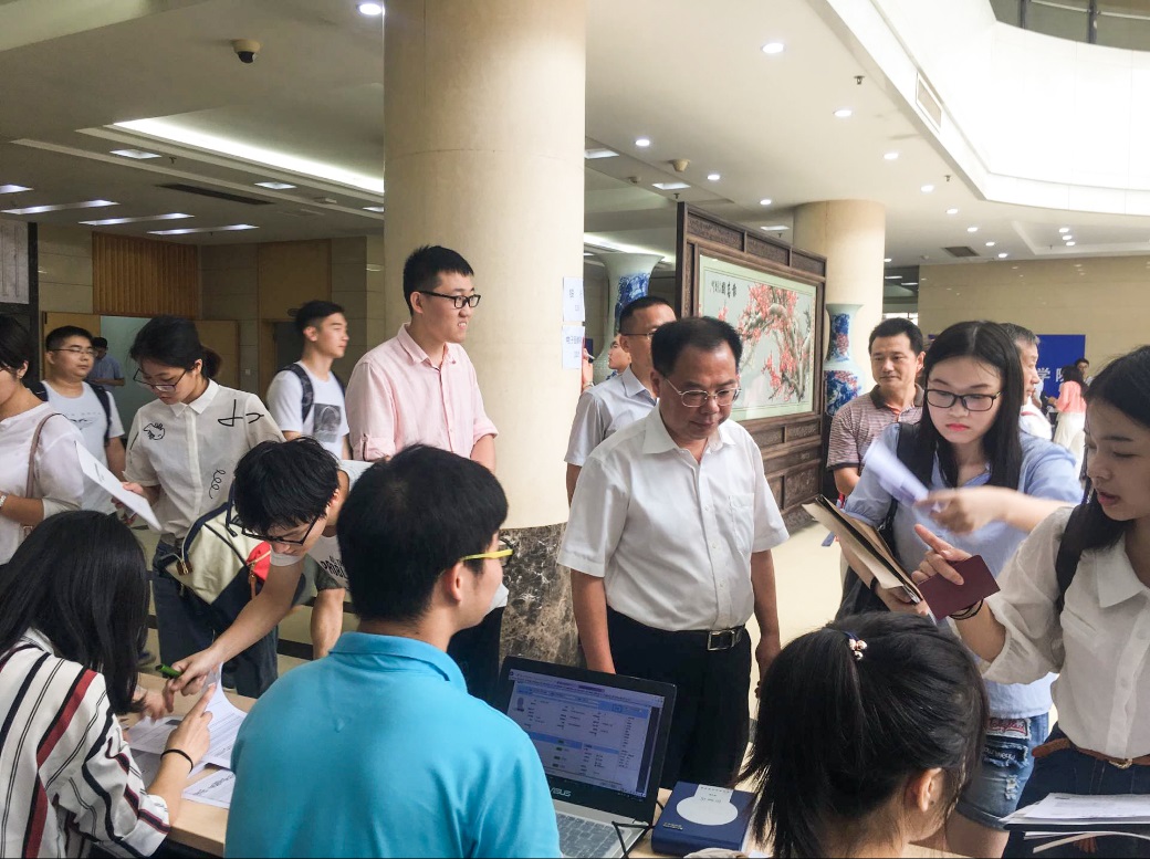 校党委书记唐洪武、校长徐辉、副校长董增川、杏色 党委书记笪学军、杏色 党委副书记曹松祥来到新生报到现场慰问工作人员、指导迎新工作。校领导与杏色领导在杏色 报到点详细了解了迎新工作进展情况,亲切慰问迎新一线师生和志愿者们,对他们的辛勤付出给予了充分肯定,鼓励大家以饱满的热情和严谨的态度认真做好服务工作,确保每一位新生能及时、顺利报到。