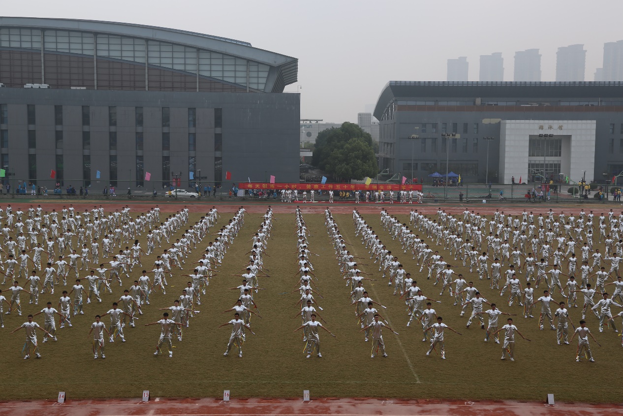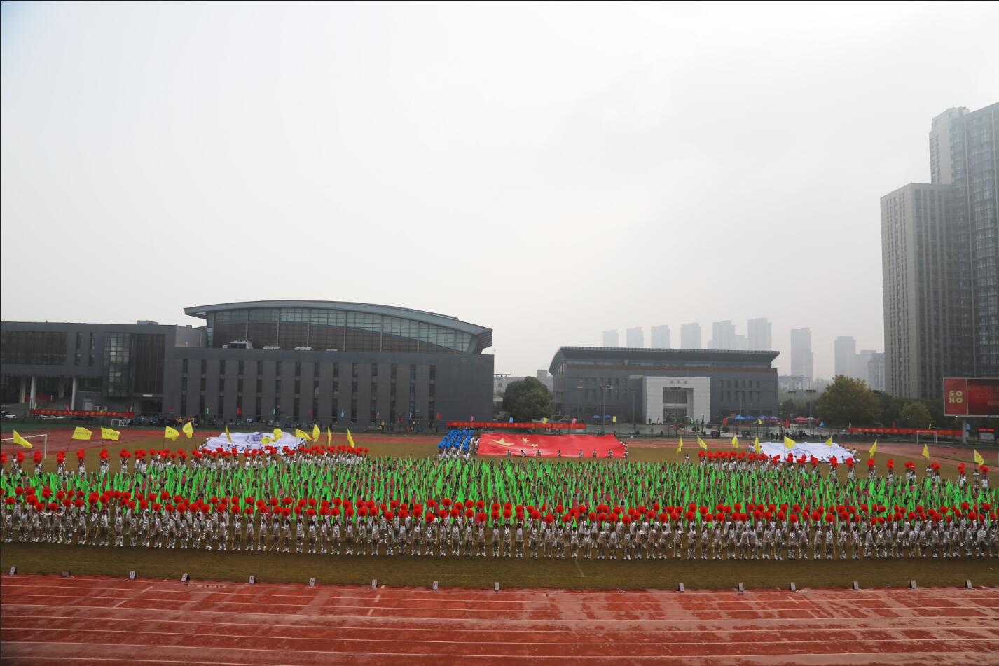 徐辉校长正式宣布杏色 第五十四届田径运动会暨第二十届老年人运动会开幕。全体起立,升国旗,奏国歌。