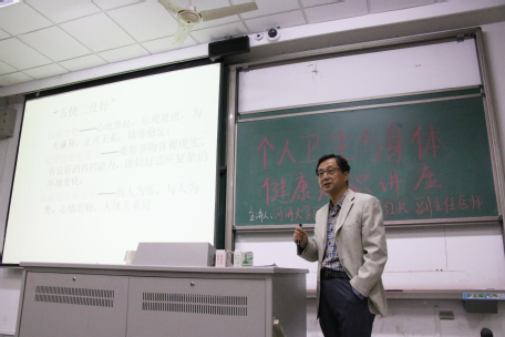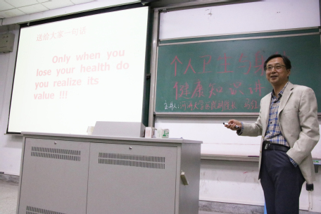 每次的健康讲座必讲戒烟限酒问题,马院长举出不少示例向同学们言说抽烟酗酒的危害,血淋淋的示例警示着同学要爱护自己的身体。