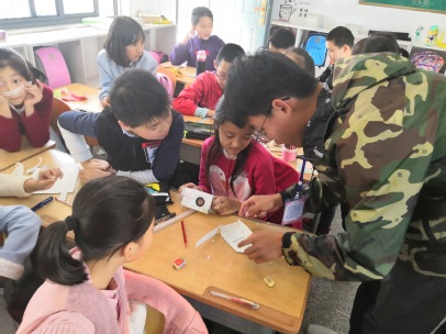 最后,是我们的手工制作环节,讲师与助教都走下讲台,帮助孩子们以小组为单位进行手工制作活动,切身体会“资源的回收与重新利用”,孩子们用牛奶盒制作成一个个漂亮的小帆船,看到自己动手的成果后,孩子们都开心地笑了。