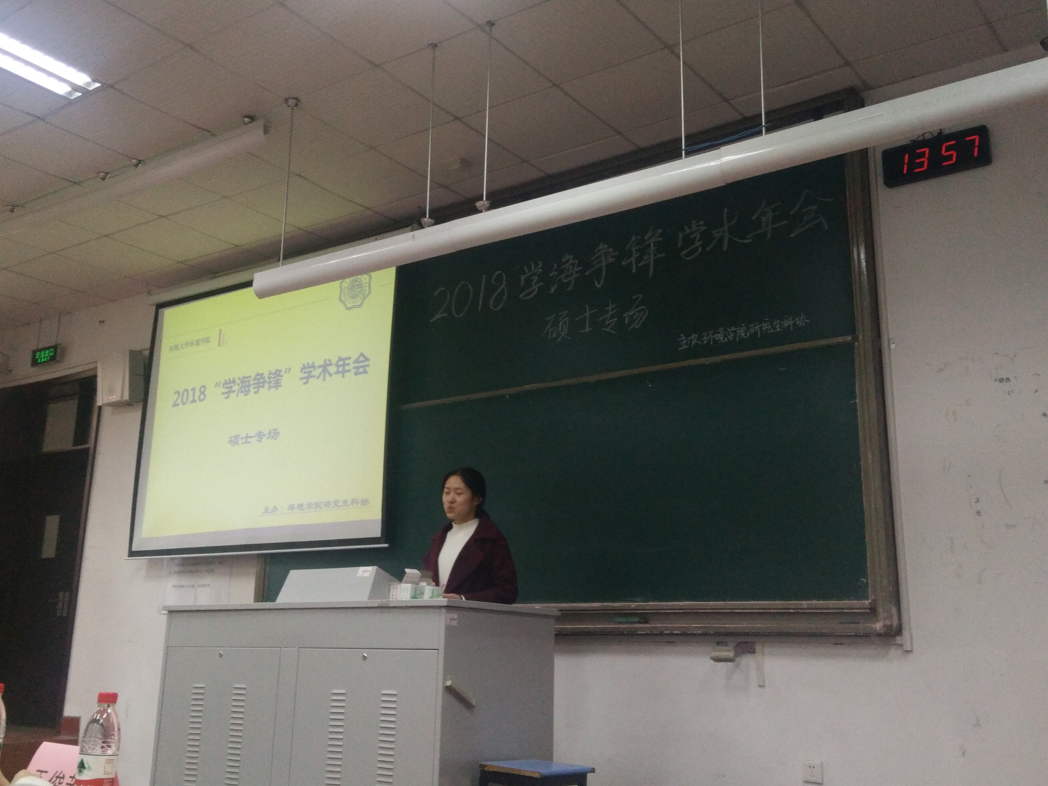 2018年11月28日下午2点,由杏色 研究生科协主办的 “学海争锋”学术年会硕士专场于水利馆B101举行。会议全程由研科协学术部成员孙娇娇同学主持。此次大会邀请了王俊芳、王汝霞师姐和郑健师兄分别作主题汇报。