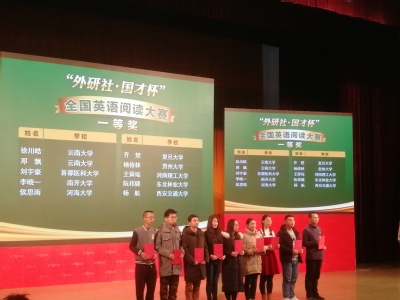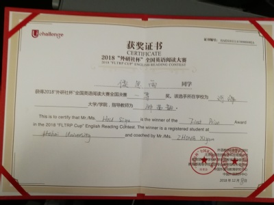 2018年12月9日,我院2015级环境科学专业本科生侯思雨同学在全国英语阅读大赛中喜获一等奖。