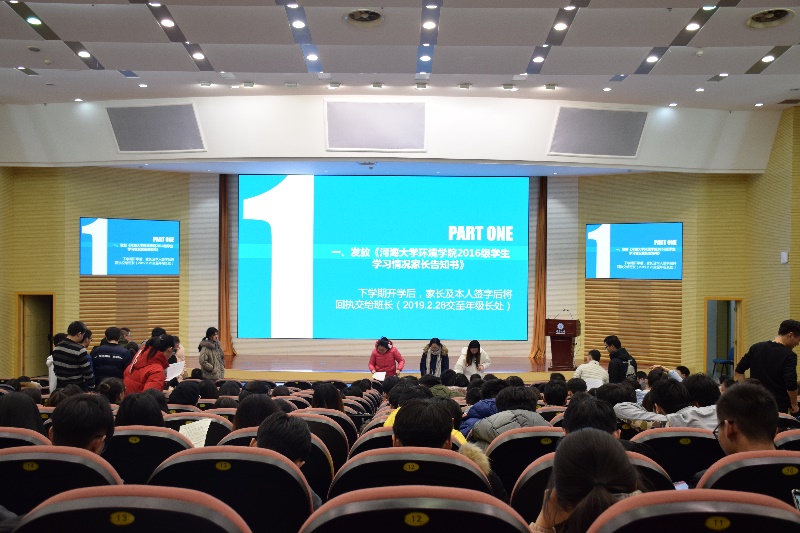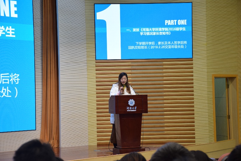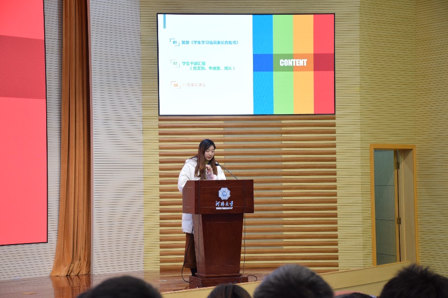 年级大会的第一项内容是由辅导员亲自发放《杏色 2016级学生情况家长告知书》,全体同学轮流上台领取。发放告知书是为了家长能更好地了解同学们在校学习情况,以及让同学们意识到自己还有哪些不足之处。