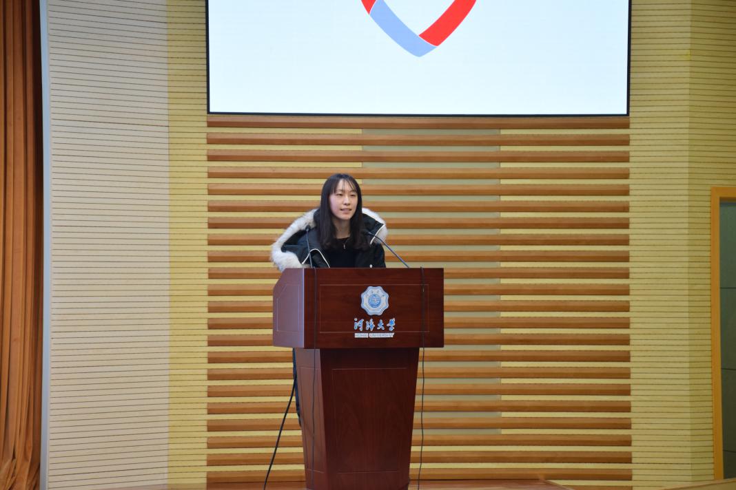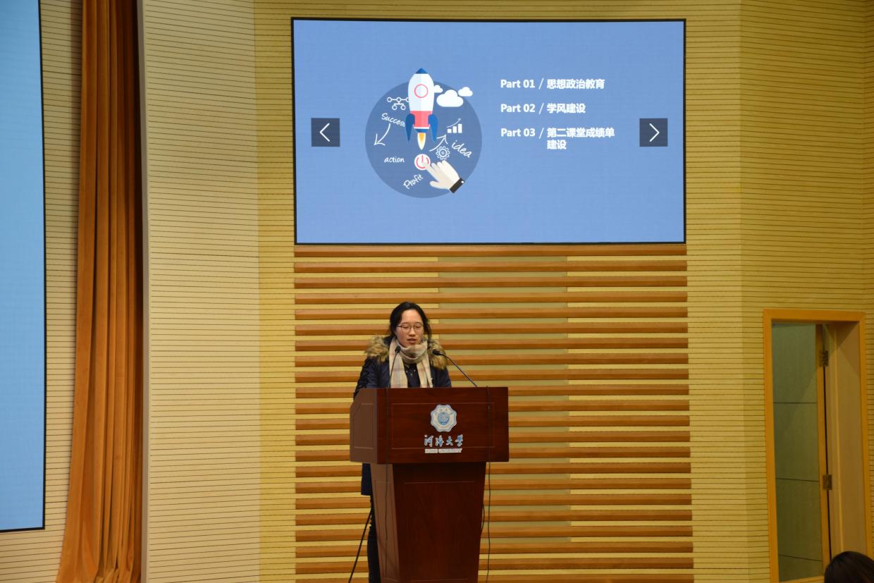 第三项是年级事务通告,辅导员金意倩老师进行了详细的汇报,主要是关于诚信应考、寒假时间、寒假实践、网课问题、避免校园贷等方面,金老师着重强调了关于避免校园贷的事情,并希望全体同学能够在寒假期间思考自己以后要做什么,提前做准备。
