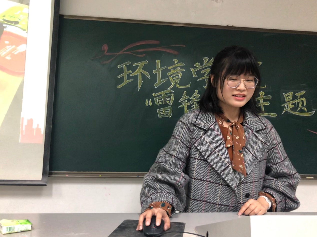 第二位是17级环境一班的王少伟同学。这位同学向我们详尽的阐述了暑期实践的意义和注意事项,令同学们收益颇深。首先是暑期实践的准备工作,同学们可以自主选题,尤其是可以选择一些对日后发展有益的活动。比如王同学选择了“海绵城市”这一主题,而海绵城市与生态环境息息相关。在实践过程中,王同学认为应当发挥雷锋的钉子精神,他在安徽省池州市(第一批进行海绵城市建设的城市之一)进行了调研,通过了解地表环境、使用材料异同、市政府对城市的环境规划、调蓄水池建设工程等,收集到繁杂丰富的数据。接着通过对信息数据的再处理,他使用直观的柱状图、饼状图以及数学建模的方式,向人们展示了该项目的成果。最后他将整个实践的成果进行了总结。