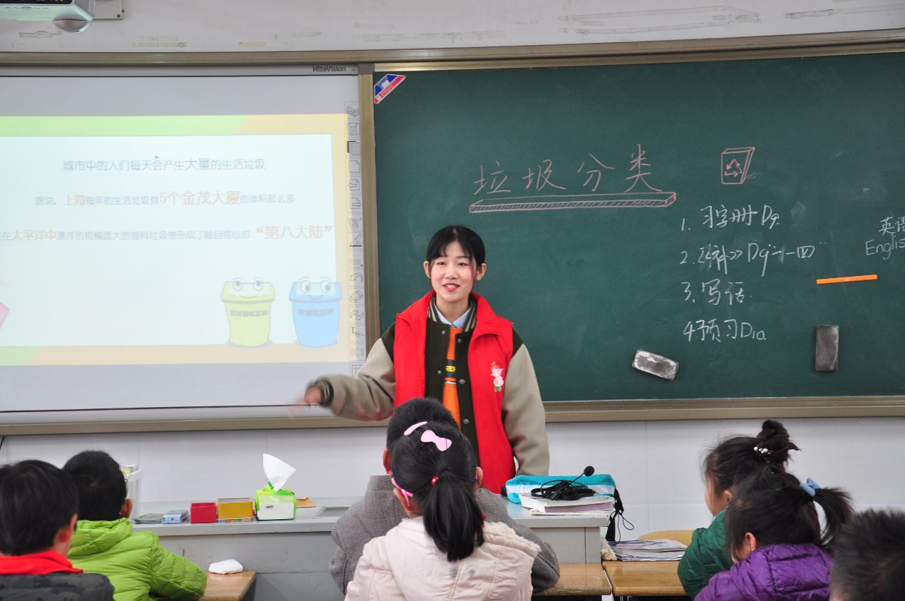 志愿者们分成了四组,一组中,一人负责讲解垃圾分类相关知识,其余三人协助讲师开展活动、维持秩序。在负责人简短交代了注意事项后,志愿者们进入了自己负责的班级。