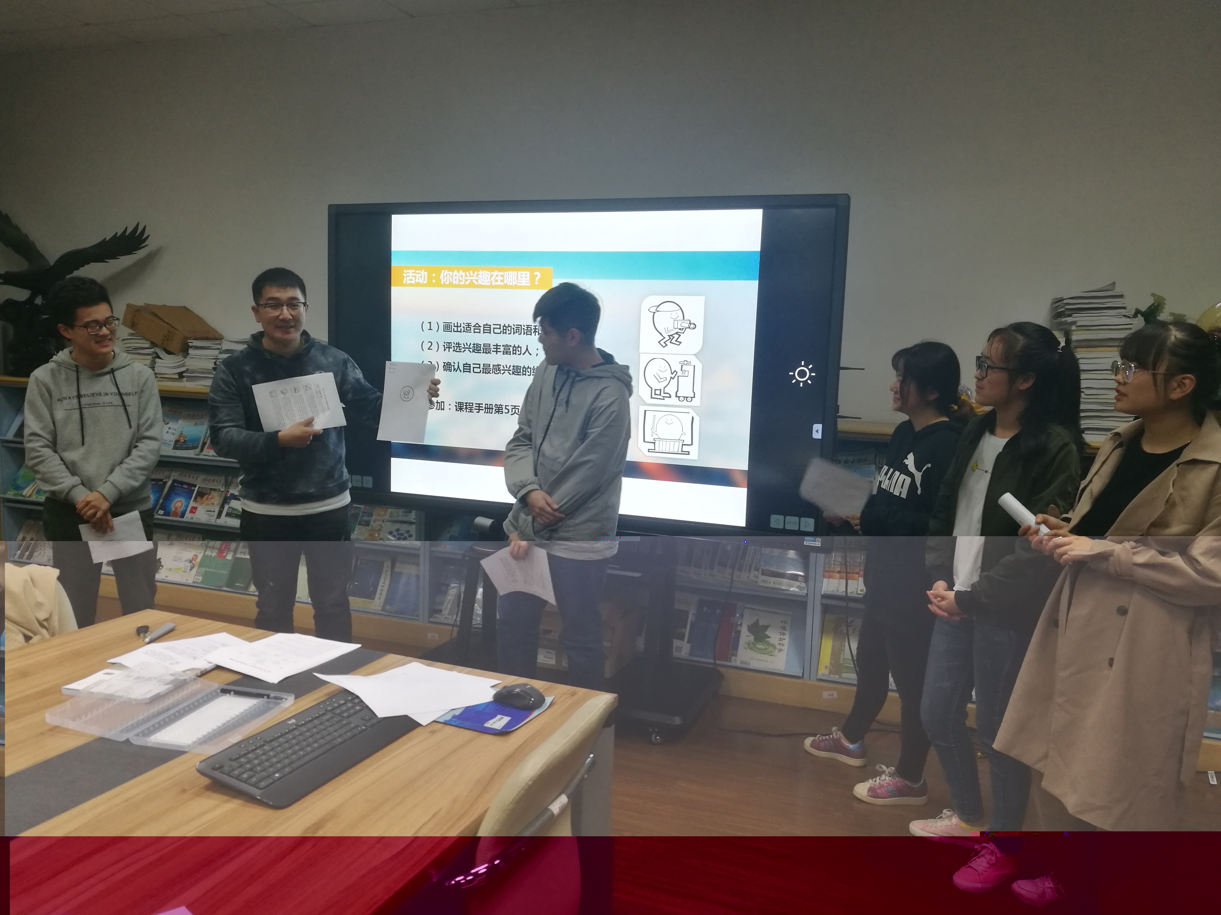 紧接着金老师通过“你的兴趣在哪里”的小活动,帮助大家深入了解自己的兴趣。金老师给每位同学都发了一张描述六种性格的纸张,大家要画出适合自己的词句与语句,确认自己最感兴趣的维度,通过测试,大家可以知道自己的职业兴趣类型,是艺术型,或是社会型,或是研究型等,最后性格维度相同的同学组成小组,进行组内讨论,归纳出兴趣首代码特点的三个关键词,同时设计出自己组的Logo并上台分享。