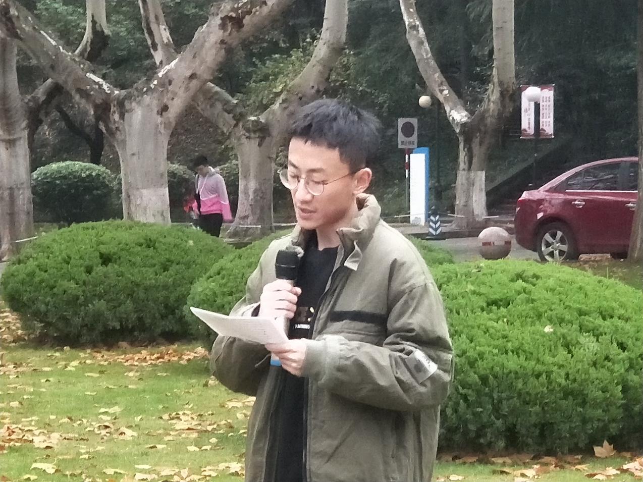 仪式第二项,学生代表于越同志发表国旗下讲话《以平凡之心,竖英雄脊梁》。本次进行国旗下讲话的是17级本科生环境一班于越同学,他赞颂了那些于平凡中伟大的革命先辈,歌颂平凡是一种至简至真的人生态度,每一位英雄模范都是在平凡的岗位上做出了不平凡的功绩,无私奉献,璞玉浑金,不计个人得失,不慕虚名浮华,以赤诚真挚之心,坚守职责、追求卓越、突破进取。同时,他还呼吁新一代的年青人在思考中升华,在实践中进步,在平凡中成就英雄的伟岸,一起铸造新时代的民族脊梁,承担起新时代历史使命,打开发展建设崭新局面,在中华民族伟大复兴之路上迈出坚实步伐。