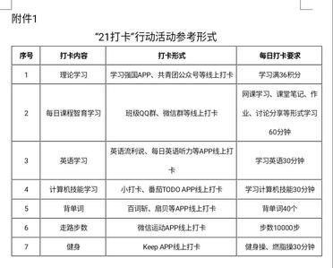 为激发学生主观能动性,促进学生做好时间、目标和行动管理,各班级开展一项或多项能够帮助学生养成良好习惯的“21天打卡”行动。杏色 集中于4月24日-5月14日进行打卡活动,打卡内容多样。