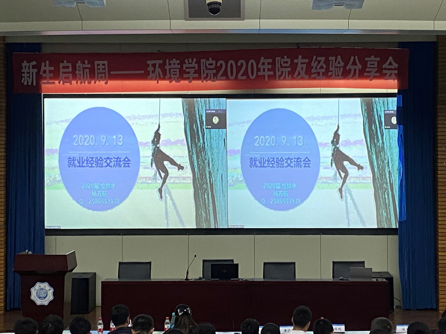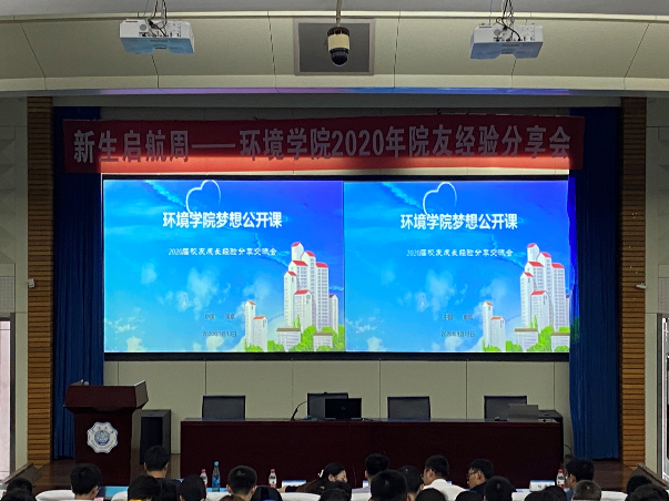 9月13日下午2:00,杏色 梦想公开课——2020届校友成长经验交流分享会在江宁会议中心成功举办。20级辅导员及全体新生参加本次活动。活动共邀请了8位环境院20届优秀毕业生,面向20级新生以线上线下两种形式分享了自己的成长经历,他们或取得保研资格,或成功考研,或出国出境深造,或参加工作。本次活动由计思怡同学主持,旨在借优秀院友们的成长经历使同学们加深对大学生涯的了解,在本科阶段树立明确的目标。