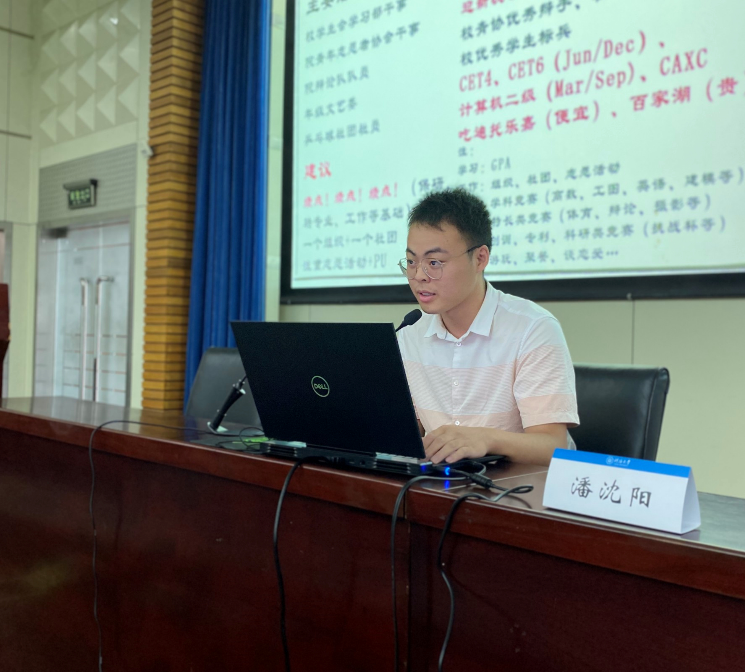 活动首先由16级环工专业潘沈阳做经验分享。潘沈阳成绩优异,综合排名位列全专业第三,获得了优秀毕业生,魅力毕业生等荣誉称号,获得直博资格,在杏色 攻读博士学位。潘沈阳分别以大学4个学年为维度,给同学们提出了建议:他建议同学们在大一重视学习成绩,适当参加学生组织;在大二努力参加竞赛,适当接触科研;在大三确定毕业后的方向,提前了解保研信息。此外,潘沈阳还向同学们介绍了大学四年需要重点注意的课程与资格考试。