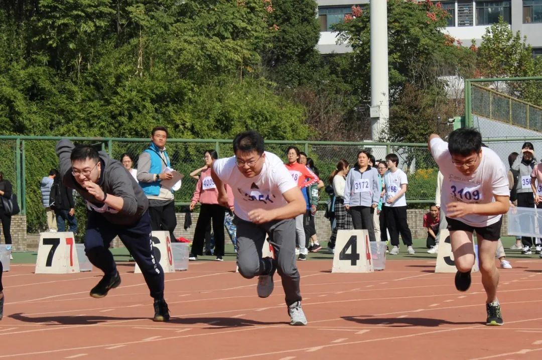 比赛正式开始。首先是万众瞩目的教职工比赛。男子100米组程宇老师、杨铮老师用热血和激情打响了第五十六届田径运动会的第一枪。女子100米组陈诗宇老师步步有力,像蛟龙般朝着终点迈进。男子铅球决赛中吴军老师和程宇老师高挥臂膀,铅球在空中挥舞出美丽的弧线。男子1000米长跑中刘玉虹老师用坚持与汗水铸就铁血荣光。