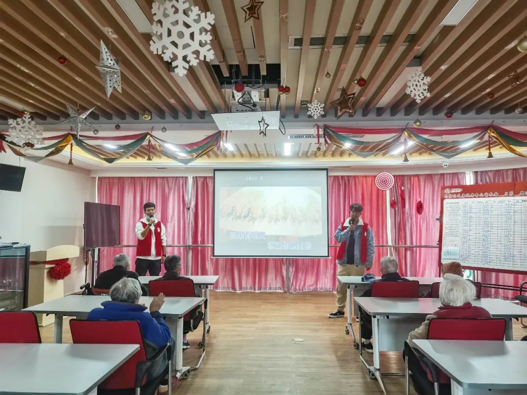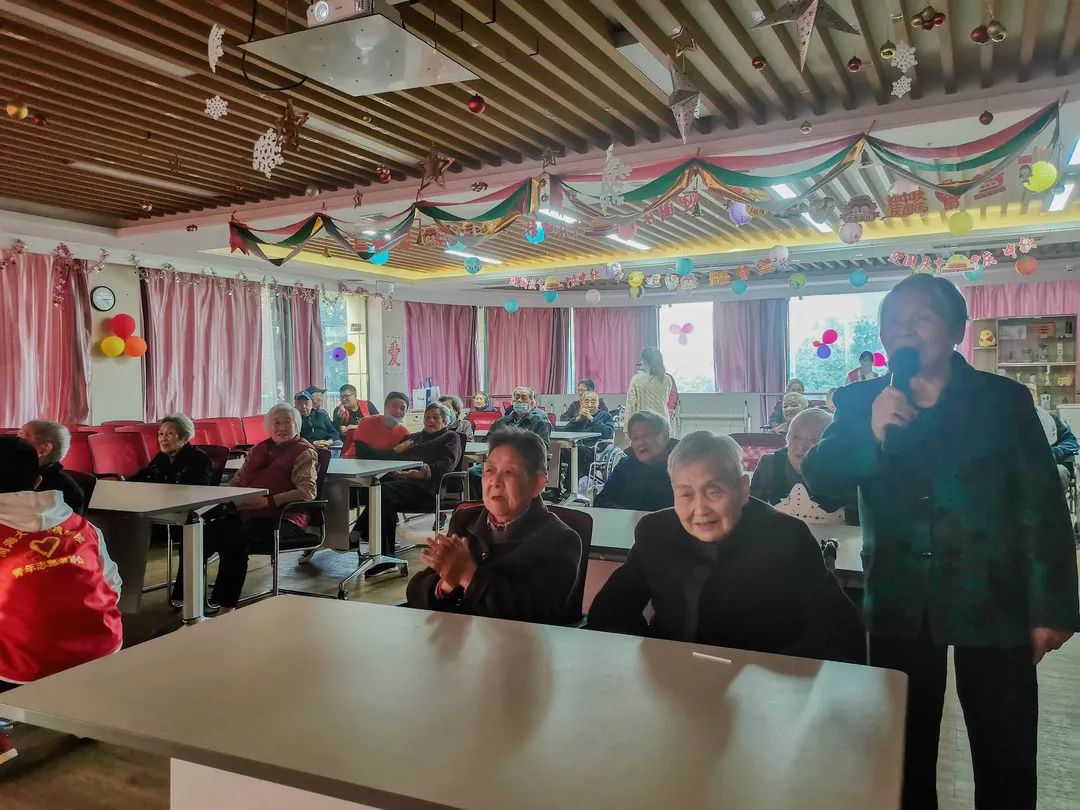 活动开始,志愿者们拿出准备好的歌曲,纷纷为老人们献上自己的拿手“绝活”。时代变迁,唯有经典的旋律能穿过岁月的重峦叠嶂,直抵人心。一首首红歌在志愿者口中传唱,正值青春的志愿者与芳华不再的老人们目光相触,默契便悄然滋生。老人们年轻时的经典曲目从小辈口中唱出,是延续,更是传承。台下的老人认真聆听,兴到浓时便接过话筒加入其中。