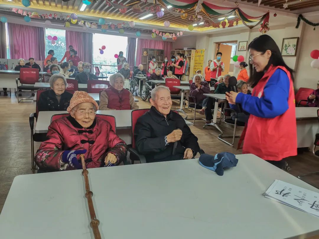志愿者们与老人亲密互动,老人们看着眼前的年轻面孔,一瞬间像是回到了自己的青春时代,忘却了烦恼,开怀大笑。