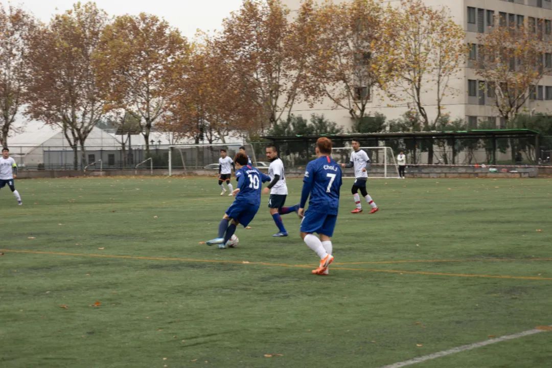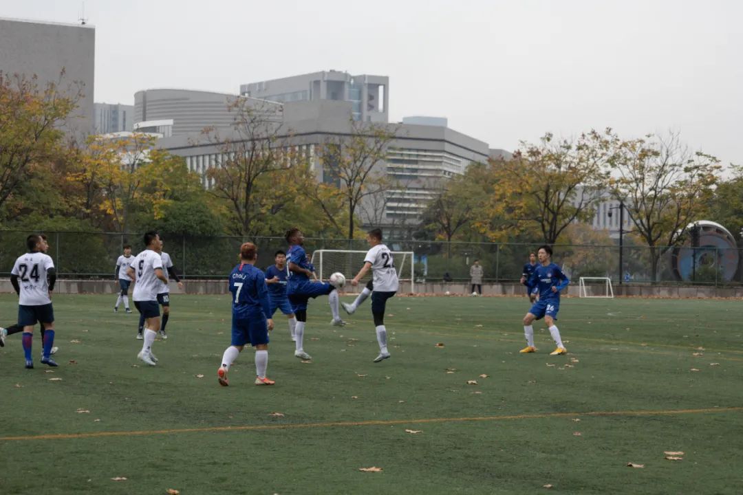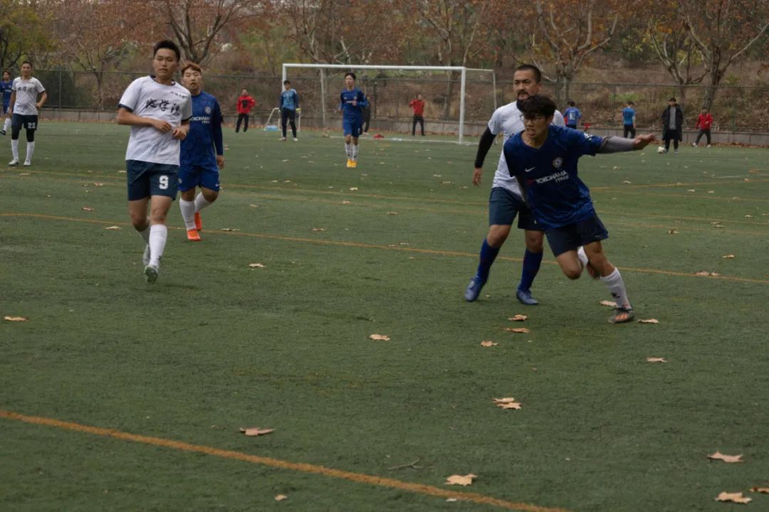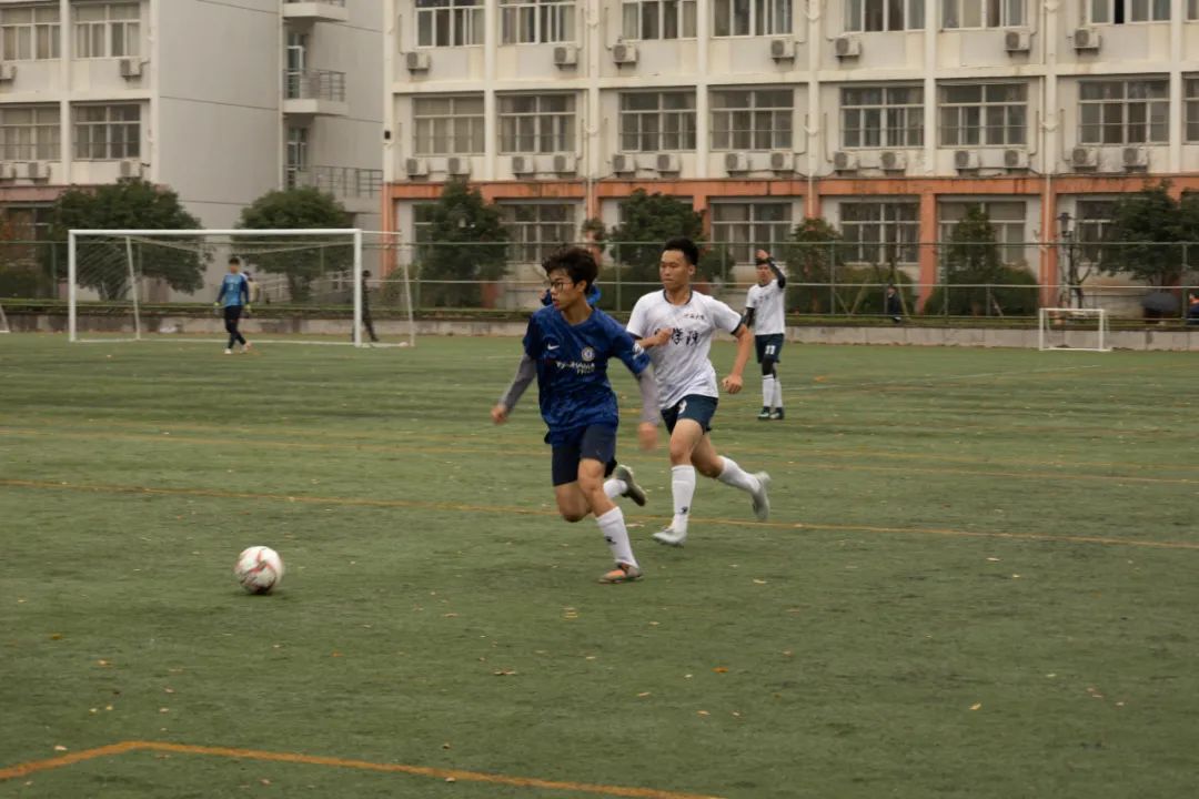 上半场比赛一开始,身着蓝色球衣的环境院球员们便与穿着白色球服的地杏色的球员们展开了拉锯战。控球、传球、过人、防守、射门、扑救,球员们在绿荫场上奋力地奔跑,彰显着青春的风采。最终,在裁判的又一声哨响后,上半场比赛结束,球员们进入休息阶段。