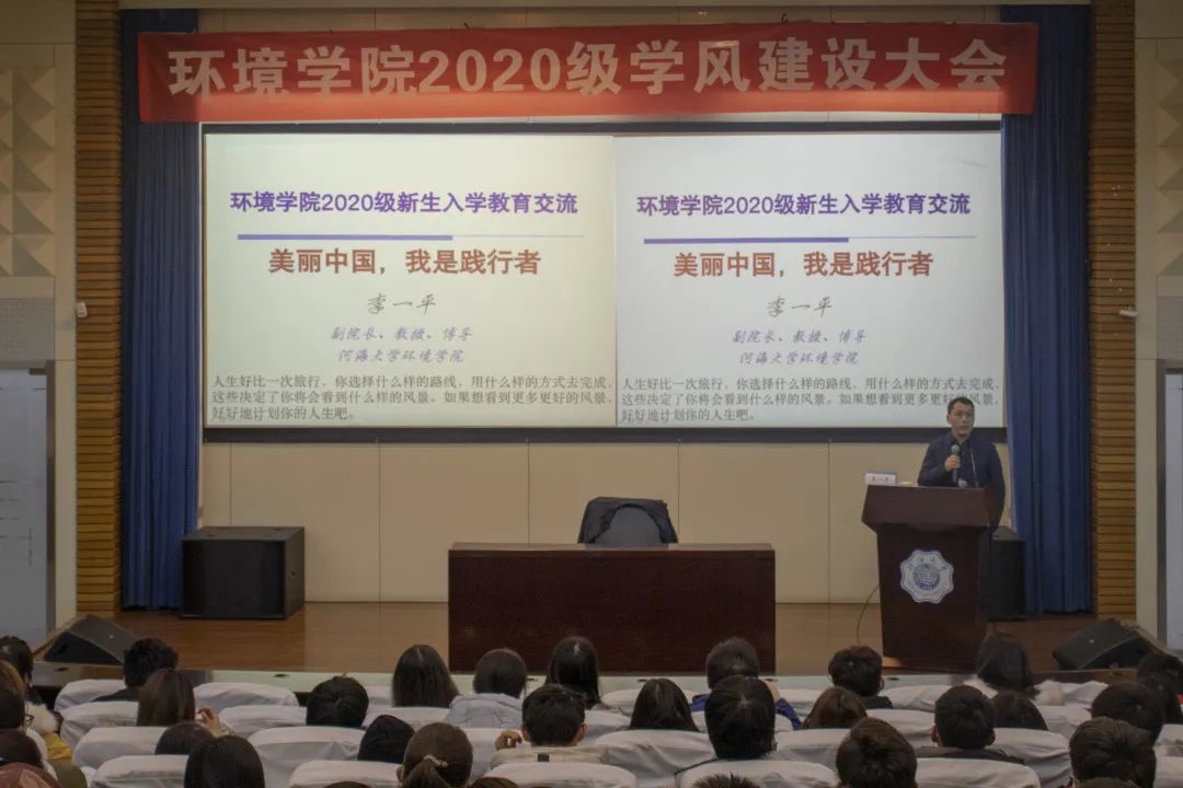 1月4日,杏色 2020级学风建设大会在江宁会议中心举行。杏色 副院长李一平教授在2021年第一个工作日,与2020级全体本科生欢聚一堂,进行亲切的交流,作《美丽中国,我是践行者》的主题报告。2020级辅导员杨铮主持会议。