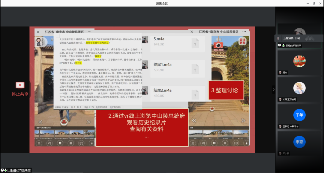 ★第四组通过VR展示了南京市的中山陵,详细介绍了孙中山先生人生中的两个重要节点,让听众们了解孙中山传奇一生的同时,更感受到红色革命者们的不懈努力。最后答辩人表述了参观的感受,通过“昨天,今天和明天”的方式抒发了革命先辈的敬爱和对未来的憧憬。