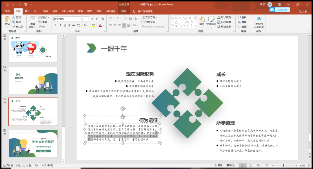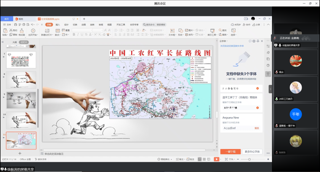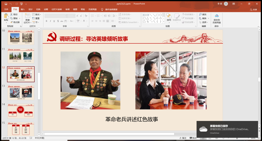 ★第十一组仅有两位成员,但二人的合作默契分工合理。她们的组名是“一眼千年”,从过去革命先烈的英雄事迹看向当今,再从当今看向祖国强盛的未来。答辩人在实践过程中切身体悟到红色革命征途的艰险困难,于是抒发了自己对于远征的看法。她认为只有在人生中历经一次次风雨后重整戎装再度前行,才是远征的含义所在。