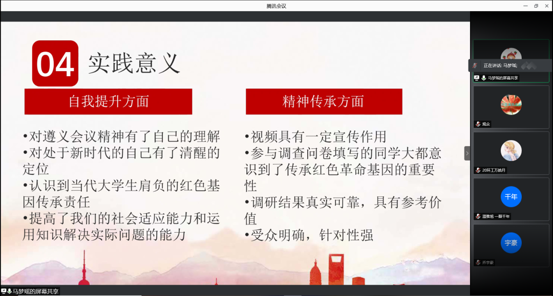 ★第二组以实践背景入手,通过学习遵义会议精神制作了相关视频和调研报告。该组成员线上线下两手抓,脚踏实地参观了遵义会议纪念馆,并且采访了当时参观纪念馆的大学生和游客,丰富了调查报告的内容,同时表现出公众对于红色经典传承的责任使命感。