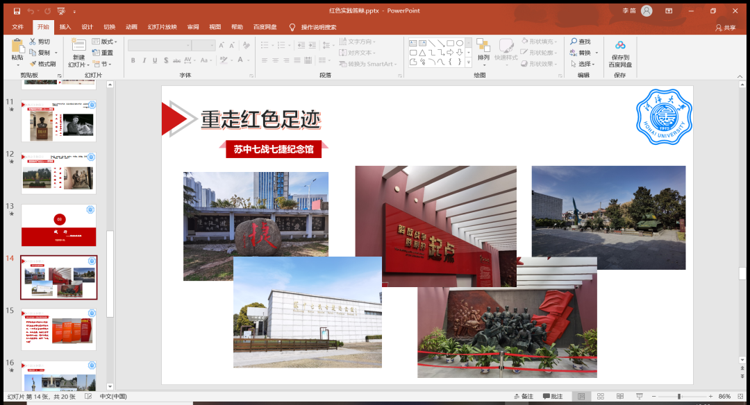 ★第九组讲述了淮安红色经典,弘扬了周恩来的伟大领导方针与思想。通过参观周恩来纪念馆、参观刘老庄革命烈士陵园和寻访英雄、倾听事迹。小组的所有成员都从此次活动中感悟到了新青年的时代责任——帮助红色历史适应时代潮流,实现中国伟大复兴的同时不忘初心。
