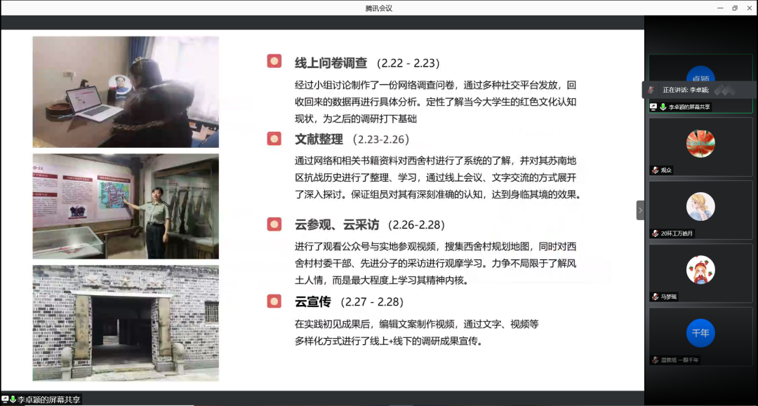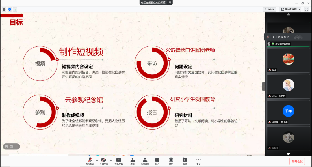 ★第三组(左图)将重心放在采访上,团队采访了抗美援朝的老兵及其家人。评委对这种调研方式称赞连连,同时提出一点小建议:可以把视频作为主要宣传载体,通过讲故事的方式使更多人了解抗美援朝,并接力红色经典。