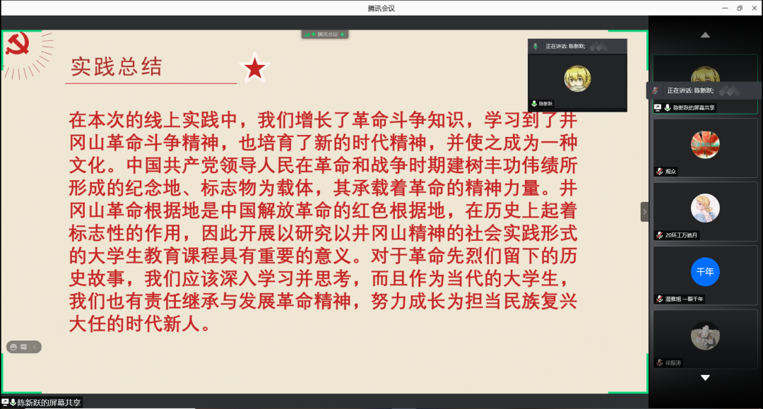 ★第八组同学先引用了纪录片,再深入介绍了纪录片背后的历史故事。学习井冈山革命斗争精神的同时也培养了时代精神,激励大学生成长为对祖国有巨大贡献的时代新人。