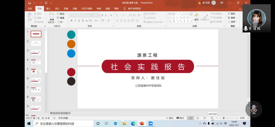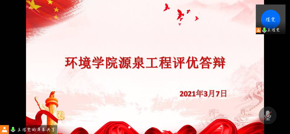 2021年3月7日下午,杏色 举办了“源泉工程”线上评优答辩。本次答辩由2020级给排水科学与工程2班王煜雯担当主持人,院团委书记金意倩老师、2020级辅导员杨铮老师、院团委副书记唐柏杨、往届寒假实践优秀获得者吴建宇以及唐国涛担任评委。