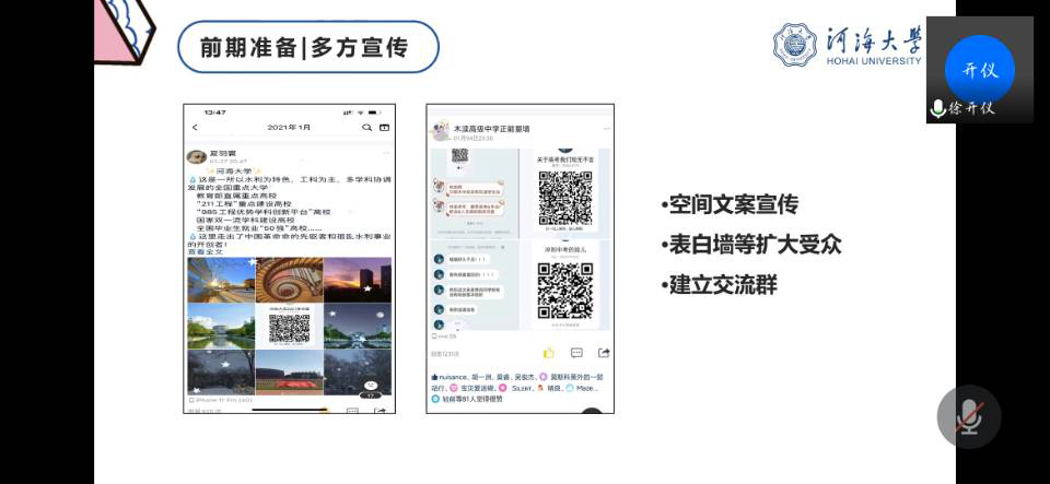 第八组在线下发放宣传材料和充分宣传了杏色 之后通过腾讯会议开展了线上宣讲,进一步提高了杏色 的知名度,传播了河海文化,弘扬了河海精神。针对各个团队在实践以及答辩中的一些细节,评委老师们也耐心的提出问题和建议,引导同学们继续改进,做出更加优秀的实践成果。
