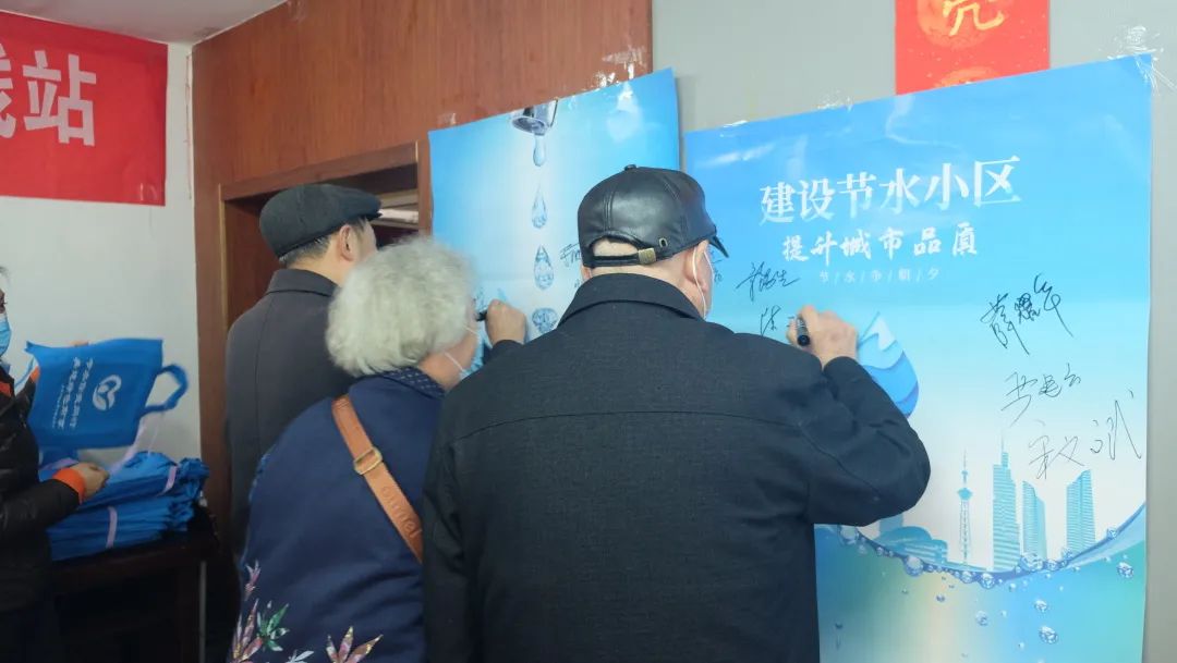 在介绍了三峡工程,南水北调工程和河长制后,志愿者们又分享了一些节水小妙招,居民纷纷点头,表示自己回家后会努力节水并发掘更多节水小妙招。活动最后,参与活动的所以社区居民在宣传海报上签下了自己的名字,展现了节水护水的决心。