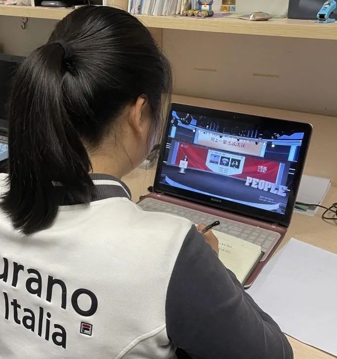 在学习党史课的现场,杏色 的同学们认真观看课程,用心体验红色精神。