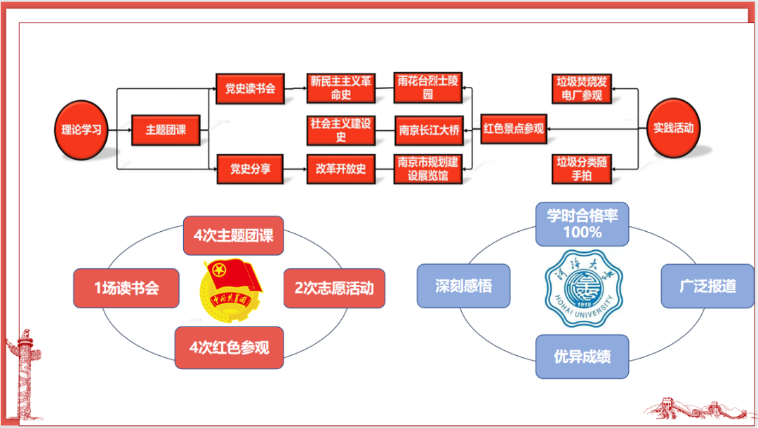 2019级环科1班首先组织同学们进行党史学习,如:参观小红梅纪念馆,主题团课教育,党史读书会,预备党员进行党史分享,采用理论学习-实地参观“1对1模式”,同时开展了一系列主题实践活动如:“忆雨花英烈,守初心永恒”雨花台烈士陵园参观,“桥渡天堑,自力更生”南京长江大桥参观,“百年一瞬过,奋进新征程”南京市规划建设展览馆参观。同时结合学科专业知识,开展了垃圾焚烧发电厂参观志愿活动,“垃圾分类随手拍”志愿活动,让班级同学了解到新型垃圾处理技术,观察到社区垃圾分类现状,感受祖国百年巨变。活动结束后,同学们在班级群中积极抒发学习感受,表达学习党史的心得体会。
