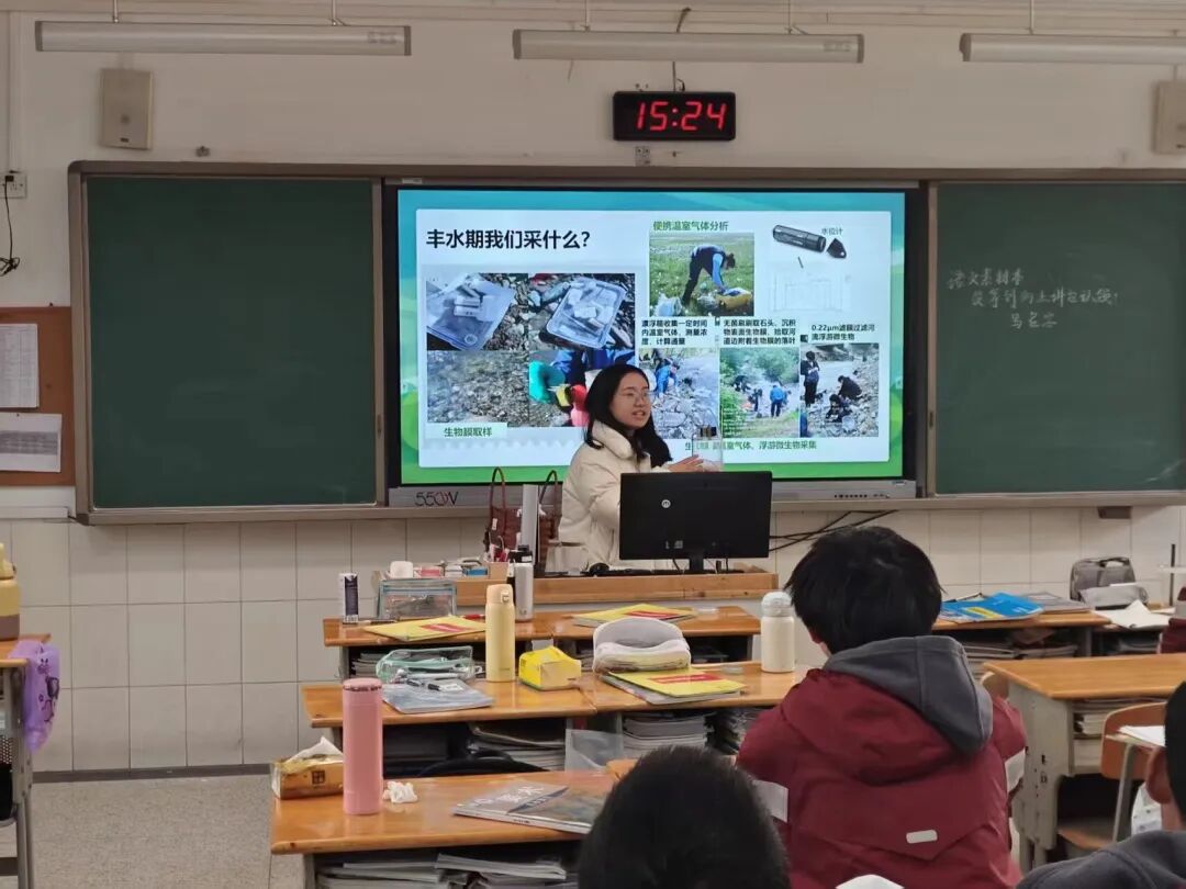 此外,课程内容兼具广度与深度。从聚焦微观技术的“藻菌生物膜”、“光催化技术”图文演示,到宏观视野下的“水体治理”、“海绵城市"建设;从讲述中国人治水故事的“水利护国”篇章,到分享拉萨科考、雅江间歇性河流追踪的实地调研经历。这种多维度的课程架构,不仅串联起了系统的水科学知识框架,更激发了中学生对国家生态治理实践的深刻认同。